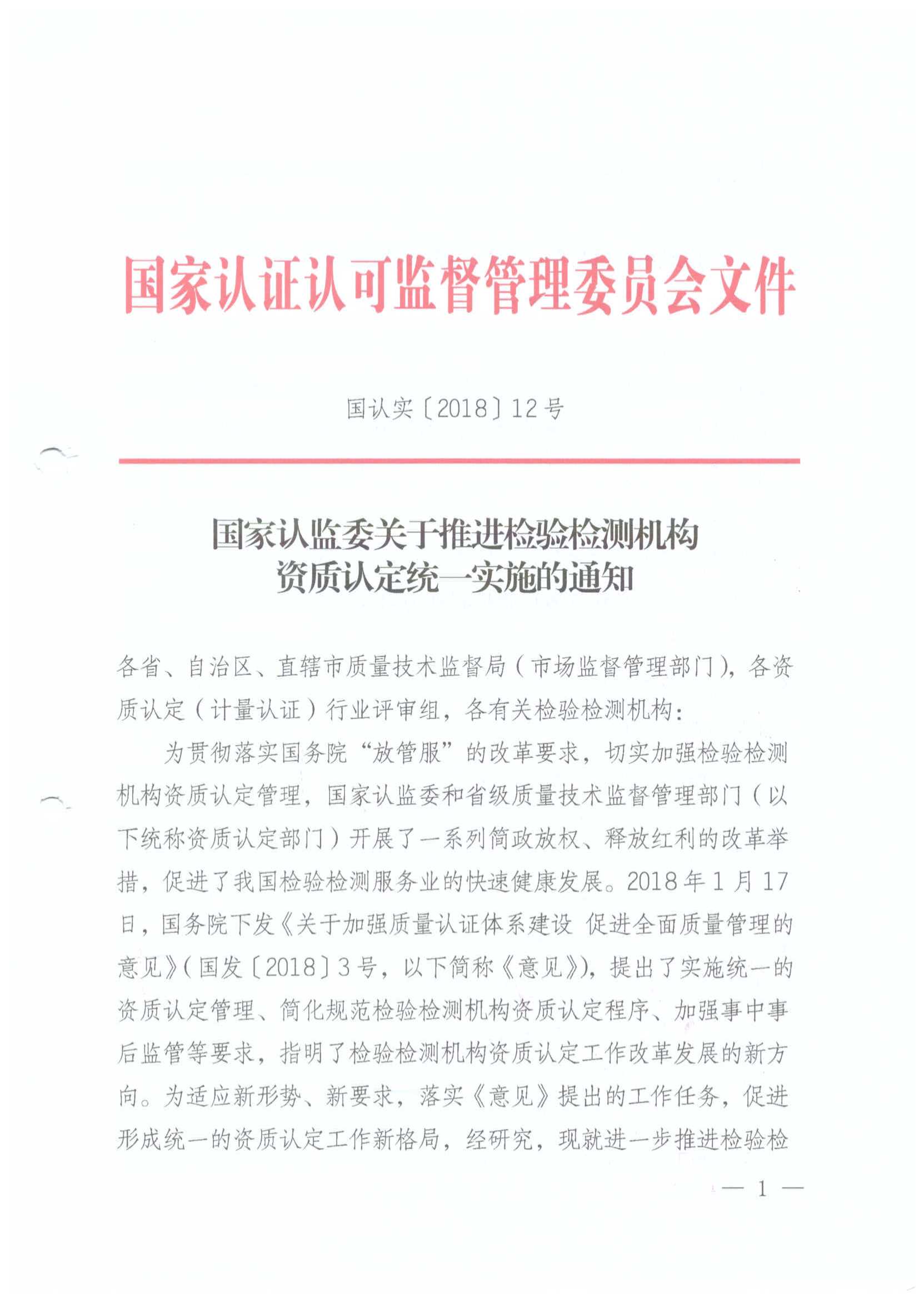 《國家認(rèn)監(jiān)委關(guān)于推進(jìn)檢驗(yàn)檢測機(jī)構(gòu)資質(zhì)認(rèn)定統(tǒng)一實(shí)施的通知》(國認(rèn)實(shí)〔2018〕12號)