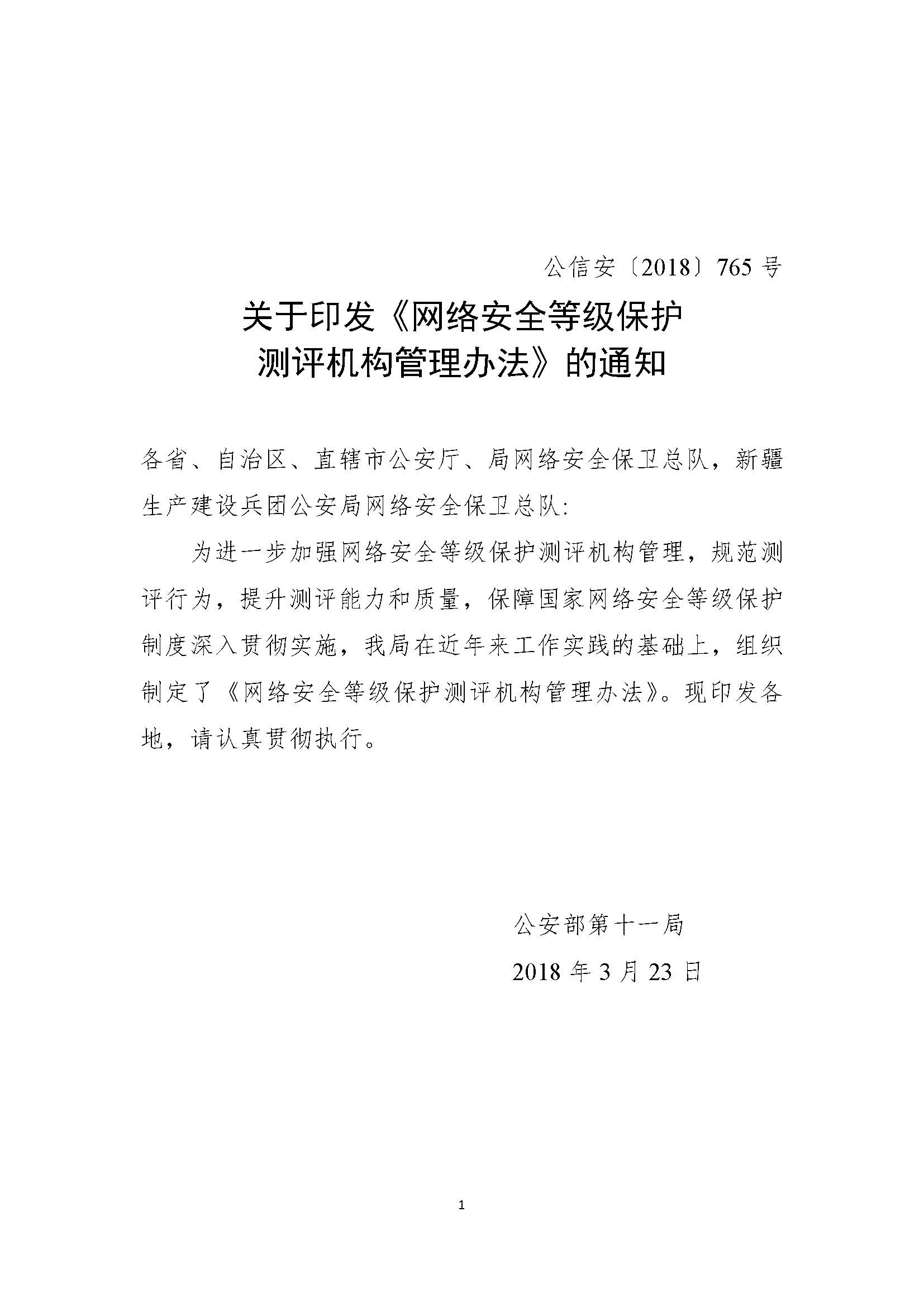 《網(wǎng)絡(luò)安全等級(jí)保護(hù)測(cè)評(píng)機(jī)構(gòu)管理辦法》公信安〔2018〕765號(hào)